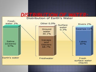 This document discusses water resources and rainwater harvesting. It covers topics like the sources and divisions of water resources, including surface water, groundwater, desalination, and frozen water. Uses of water resources include agricultural, industrial, and household uses. The document also discusses ways to conserve water, the benefits of rainwater harvesting, and techniques for rainwater harvesting like collection, storage, and recharge of groundwater. Rainwater harvesting provides many benefits like self-sufficiency of water supply and improved groundwater quality.
