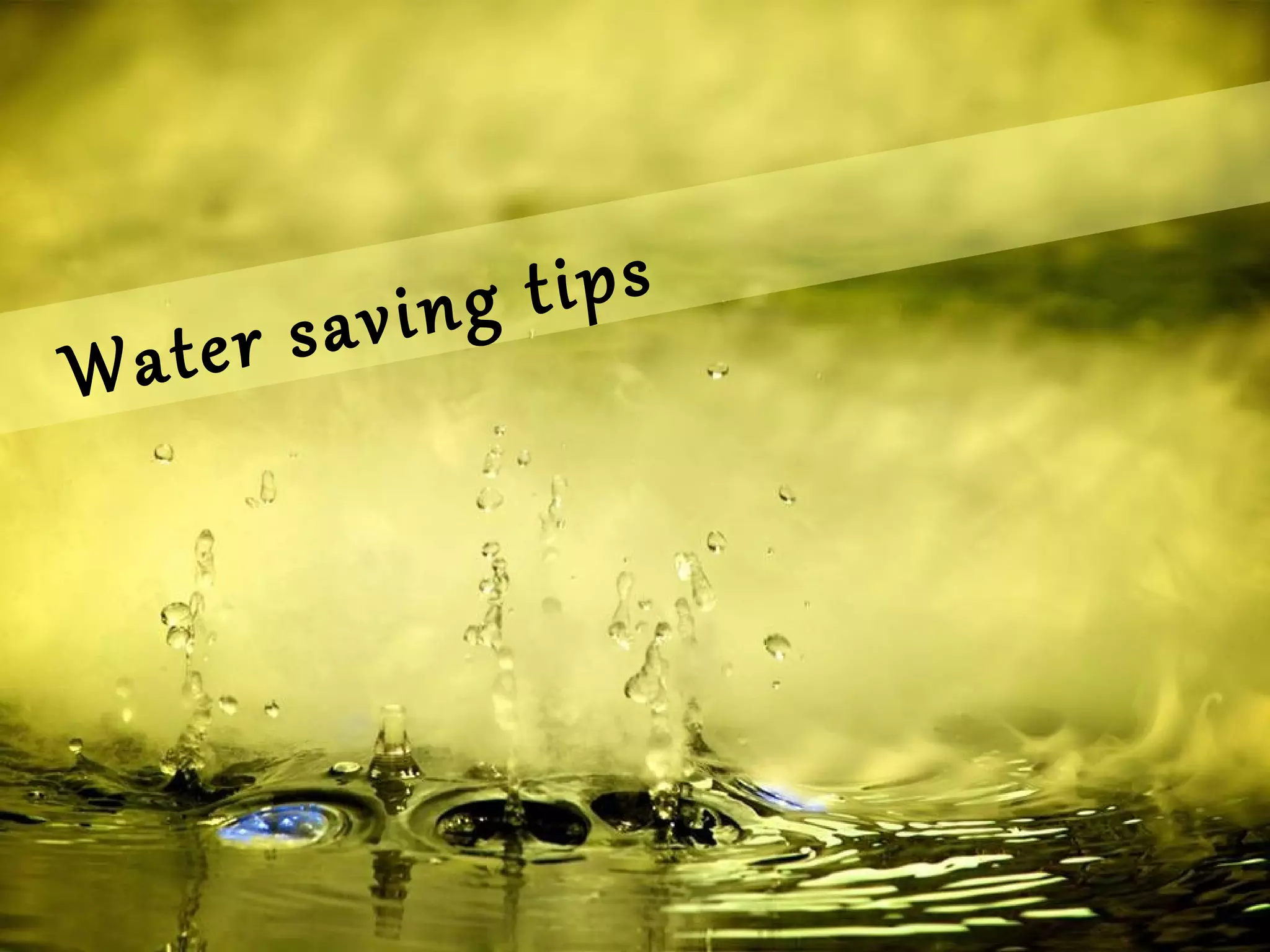 Use water efficiently by taking shorter showers, fixing leaks, installing efficient showerheads, turning off water while brushing teeth, and using rainwater to water plants. Check for ways to save water around the house from showering to watering the garden.