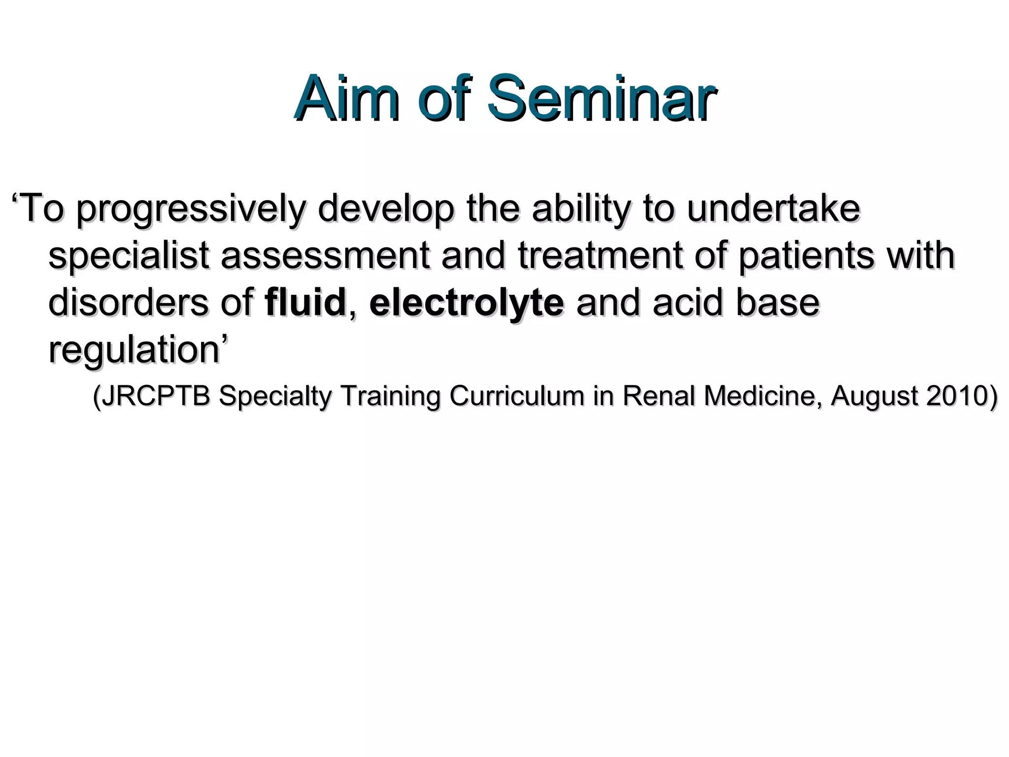 The document discusses fluid and sodium handling, particularly dysnatremias, with a focus on the assessment and treatment of disorders related to fluid, electrolyte, and acid-base regulation. It details the physiological aspects of sodium and water balance, hyponatraemia classifications, case studies highlighting various causes of hyponatraemia, and the mechanisms regulating water excretion and antidiuretic hormone (ADH) function. The seminar aims to enhance the understanding of these concepts to aid in clinical practice.