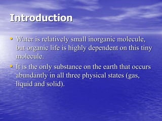 This document discusses the structure and properties of water molecules. It explains that water molecules are made up of an oxygen atom bonded to two hydrogen atoms, giving the oxygen a partial negative charge and the hydrogens a partial positive charge. This allows the molecules to form hydrogen bonds with neighboring water molecules. The hydrogen bonding between water molecules forms a three-dimensional network and gives water its unusual properties, such as its high heat capacity and boiling point. The dynamic hydrogen bonding allows water to easily flow and change states while maintaining its cohesive liquid properties.