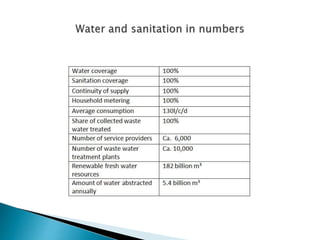 Germans use water efficiently, with each citizen using about 130L per day due to high water prices, minimal loss in distribution systems, and efficient water circulation. Germany has high quality water supplied by over 6,200 local providers to private households and small businesses, while energy, industrial, and mining companies often abstract water directly. Municipalities are responsible for fresh water supply and sewage treatment through a network of around 500,000km of drinking water pipes. Water scarcity is low in Germany, which abstracts only 3% of its total renewable water resources.
