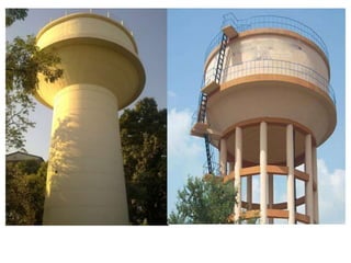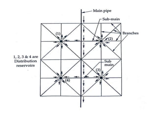 This document discusses various pipe appurtenances used in water distribution systems. It describes common appurtenances like fire hydrants, valves (sluice valves, check valves, air valves, drain valves, scour valves), and layouts of distribution networks (dead-end system, grid-iron system, ring system, radial system). It also covers distribution reservoirs (surface storage tanks, elevated storage tanks, stand pipes), their functions, and factors to consider when selecting pump horsepower for water distribution systems.