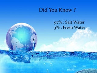Only 3% of the world's water is fresh water, which is found as surface water, in rivers underground, frozen in glaciers and ice caps, or as groundwater. The water cycle ensures the continuous movement of water on, above, and below the surface of the Earth. Globally, an estimated 69% of fresh water is used for agriculture, 22% for industry, 8% for domestic purposes, and a very small percentage for recreation. Water is treated and stored before being distributed to homes and buildings through a network of pipes and storage systems.
