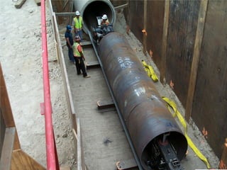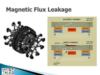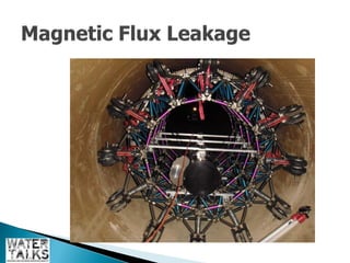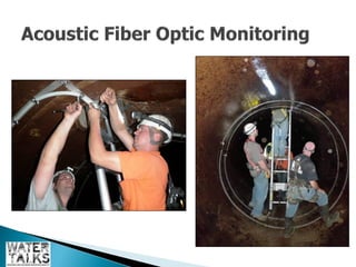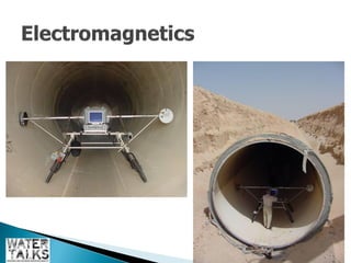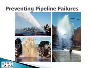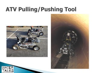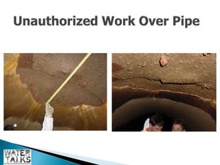 The document outlines the operations and maintenance practices for water pipelines, detailing the types of pipes used and construction methods. It emphasizes the importance of data collection for assessing pipeline performance and health, including techniques for both in-service and out-of-service evaluation. Additionally, it discusses the benefits of utilizing remotely operated vehicles (ROVs) for inspections, highlighting their role in reducing costs and environmental impacts.
