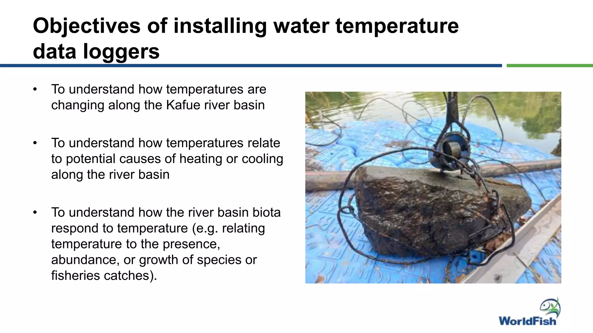 This document discusses the monitoring of water temperatures in the Kafue River basin using data loggers to understand how temperatures impact the river's biota. Objectives are to see how temperatures change along the basin and relate to species presence, abundance and fisheries catches. Temperature influences many factors and is key to biological processes. Data loggers were installed in accessible areas with adequate depth and water mixing. Preliminary data shows variations between locations impacted and not impacted by mining activities. Next steps are continued data collection and analysis to understand temperature shifts and potential mining influences, and relate temperatures to optimal growth periods for key fish species.