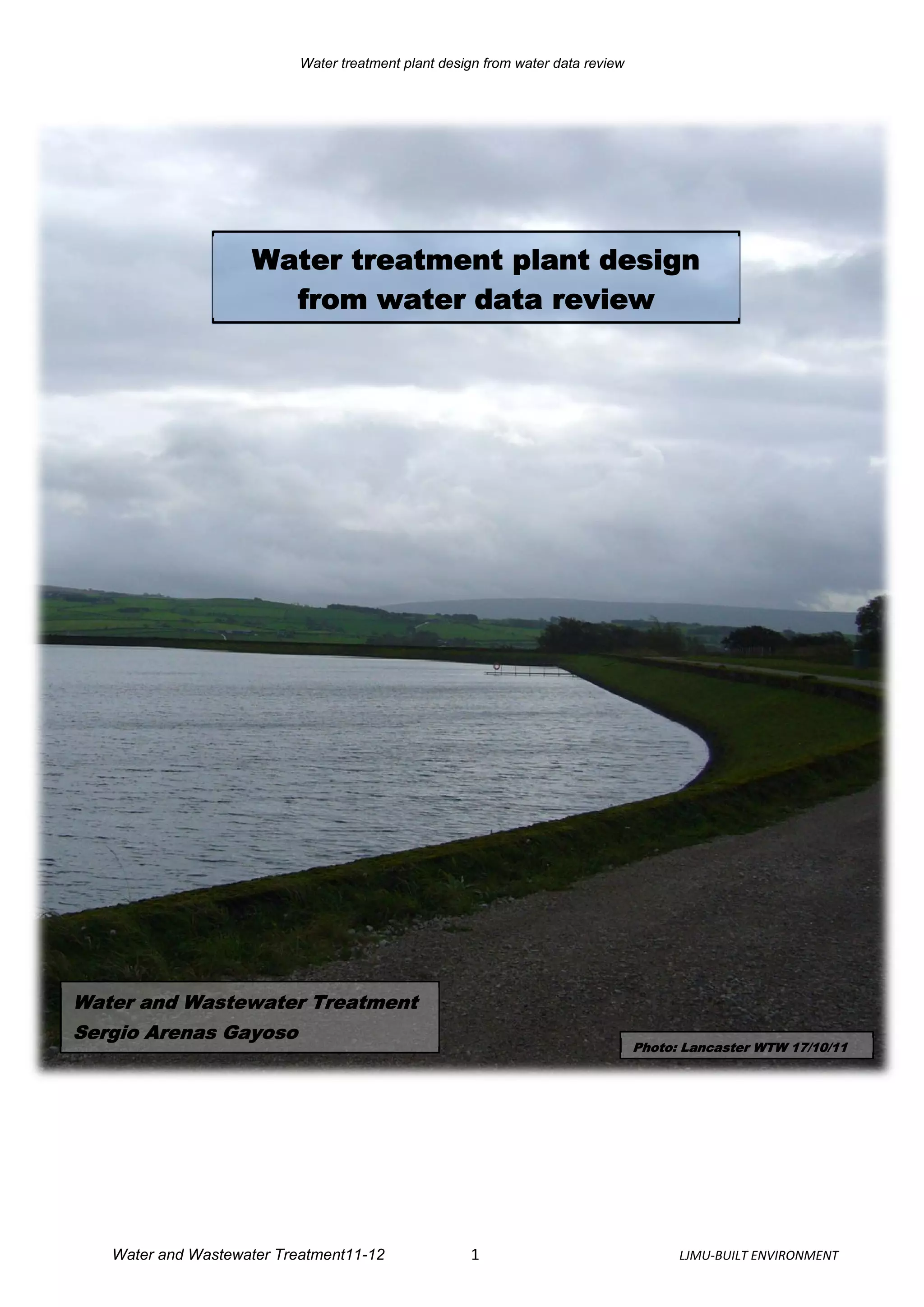 The document reviews water quality data from a source over three years to design a water treatment plant. It analyzes parameters like pesticides, nitrogen, hardness, conductivity, metals, microorganisms, radioactivity, turbidity, color, and TOC. Based on the data, the source water is characterized as a surface water source in an agricultural area with some livestock. A risk assessment is then conducted to identify control measures and monitoring needs for the water safety plan. Finally, a treatment plant design is proposed to address parameters like coliform removal, cryptosporidium reduction, disinfection byproducts, and the removal of turbidity, manganese, aluminum, and pesticides.