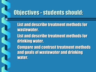 Disinfection of drinking water is necessary to destroy microorganisms and make water safe for consumption. Common disinfection techniques include physical methods like boiling and UV light, as well as chemical methods such as chlorine, bromine, iodine, and ozone addition. Chlorine disinfection is the most widely used approach due to its low cost and effectiveness, but can produce harmful byproducts and alternatives like ozonation are more expensive. The selection of disinfection method involves considerations of safety, costs, effectiveness, and other factors.