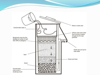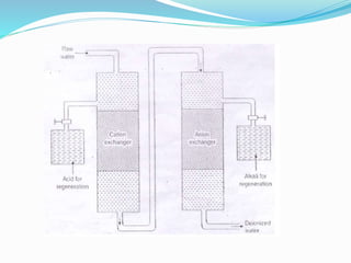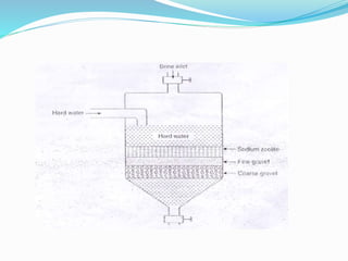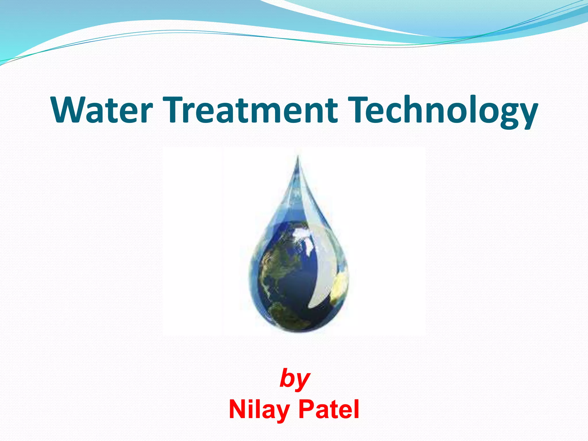 The document discusses various water treatment technologies. It describes the goals of water treatment as removing turbidity, chemicals, and pathogens from water sources in an affordable and timely manner. It then outlines different water sources and uses. The document details various impurities found in water and methods to remove them, such as screening, sedimentation, coagulation, filtration and sterilization. It also discusses specific technologies for treating boiler feed water and softening hard water, including internal and external treatment methods.