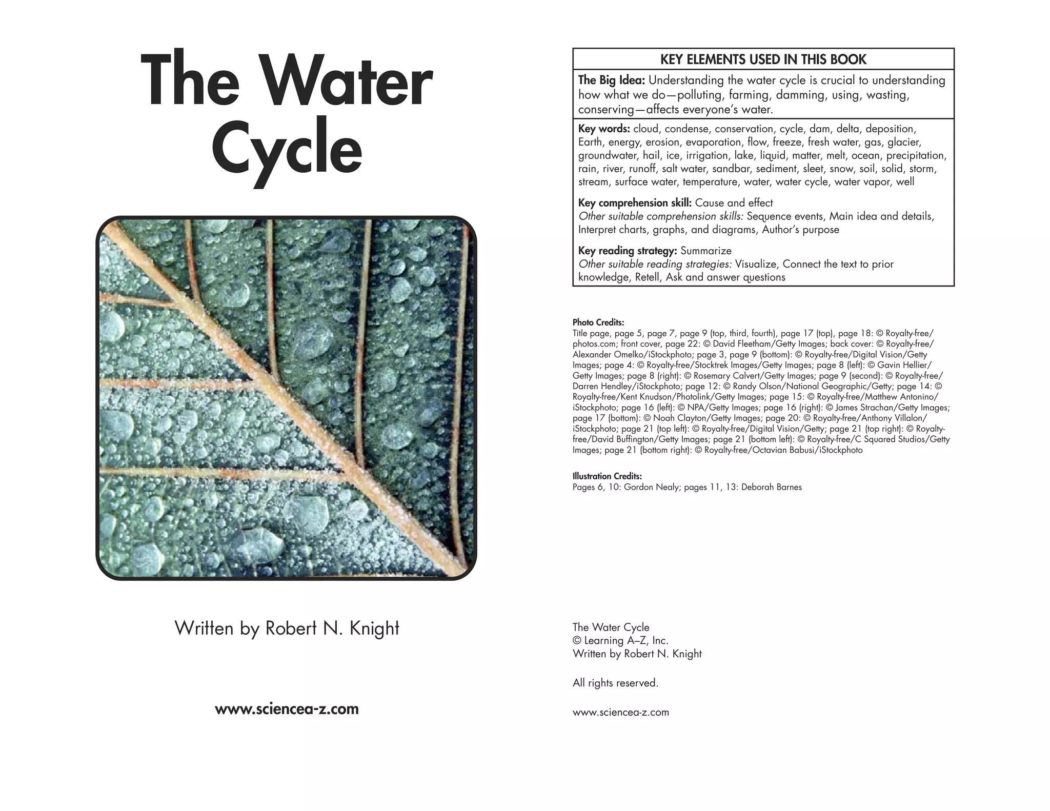 The water cycle describes how water is circulated around Earth through different states as solid, liquid, and gas. As the sun warms water, it evaporates as vapor into the air, condenses into clouds, and falls back to Earth as precipitation on land and ocean where some is absorbed in the ground, stored in lakes and rivers, and flows out to sea, completing the cycle. Understanding the water cycle is important because human activities like pollution, farming, and development can impact available fresh water.