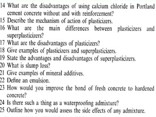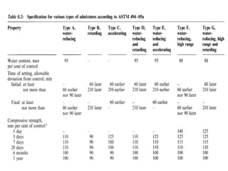 This document discusses water and admixtures used in concrete. It describes how the quality of water can impact concrete strength, durability and corrosion. It outlines acceptable limits for impurities in water and discusses the effects of seawater. It also categorizes and explains the purpose and effects of different types of admixtures (A-F) including water reducers, retarders, accelerators and superplasticizers. Specialty admixtures like air-entraining and waterproofing are also briefly covered.