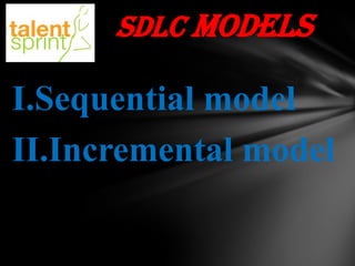 The document describes the waterfall model of software development. It begins by listing the presenters and defining sequential and incremental software development models. It then discusses the waterfall model in more detail, describing it as a linear sequential process where each phase must be completed before the next begins. The document outlines the history, use cases, diagram, phases and advantages/disadvantages of the waterfall model.