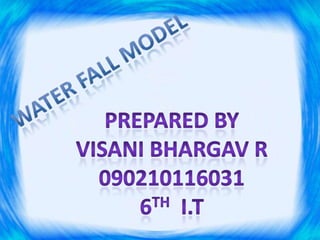 The document discusses the waterfall model of software development. It describes the five phases of the waterfall model as requirements gathering and analysis, design, coding, testing, and maintenance. It provides details on the activities in each phase, including documenting requirements, designing logical modules, writing code, testing software, and maintaining the system. The waterfall model is advantageous for small projects but inflexible if requirements change, as it is a sequential process where each phase must be completed before the next.