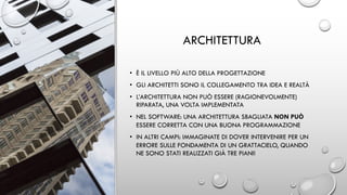 Il documento esplora l'importanza dell'architettura del software, sottolineando che una cattiva architettura può portare a errori difficili da correggere. Descrive vari modelli architetturali, come layered, client-server e model-view-controller, evidenziando i loro utilizzi specifici e i vantaggi nel facilitare lo sviluppo e la manutenzione del software. Infine, viene suggerito di proporre architetture per progetti sfruttando gli architectural patterns presentati.