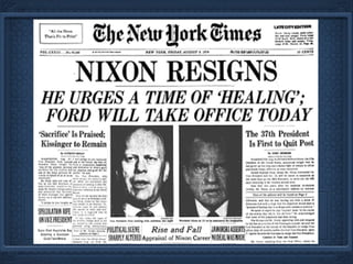 The Watergate Scandal involved a 1972 break-in at the Democratic National Committee headquarters at the Watergate office complex in Washington D.C. by burglars associated with President Richard Nixon's re-election committee. Investigative reporting by Bob Woodward and Carl Bernstein revealed the Nixon administration sought to cover-up its involvement. Further investigations uncovered additional illegal activities and a Nixon administration plot to sabotage the Democrats. Faced with impeachment and the release of damning audio tapes, Nixon resigned in 1974, becoming the first U.S. president to do so. The scandal had major political impacts, including curtailment of presidential power and increased public distrust in government.
