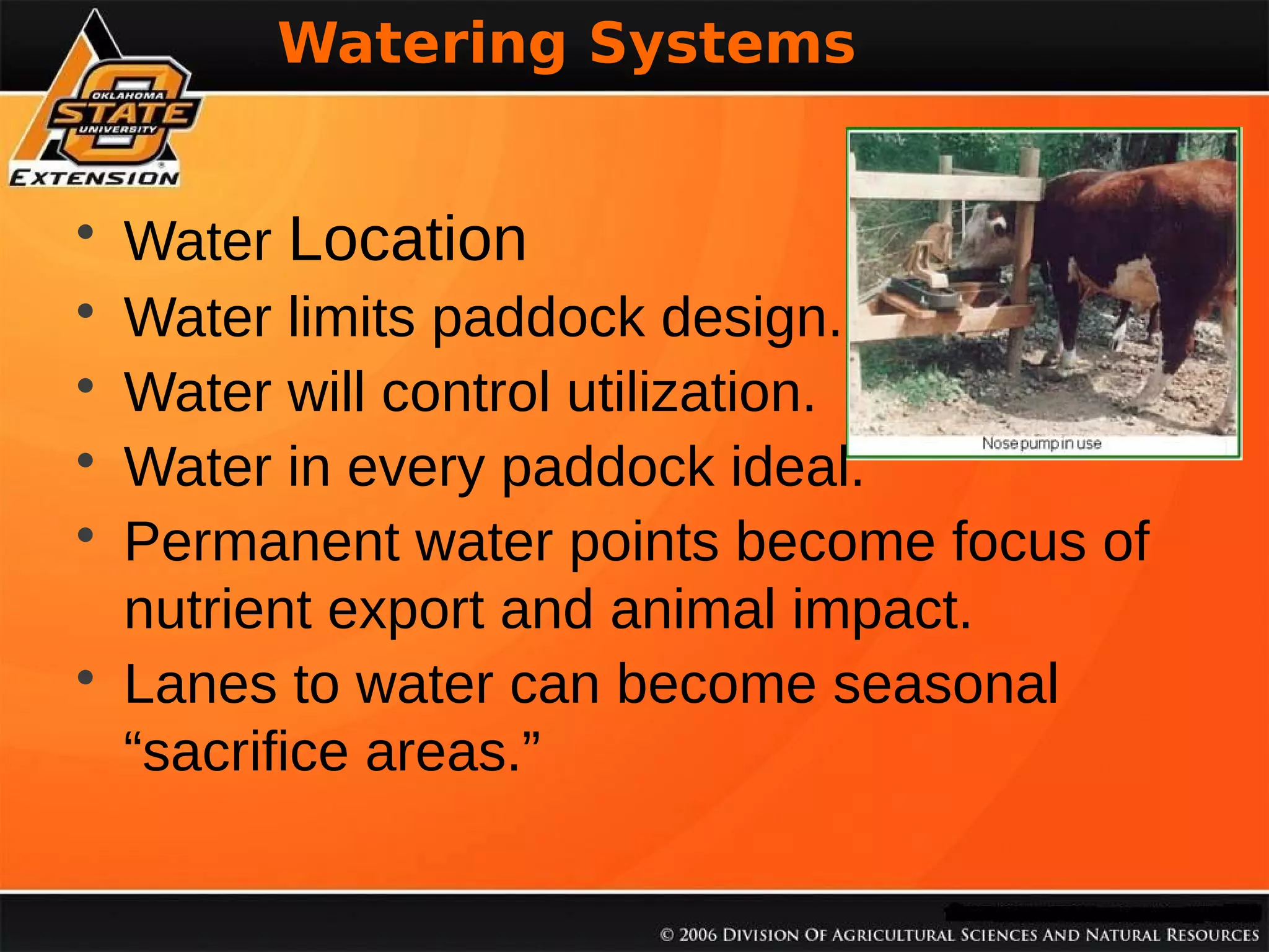 The document discusses various watering systems and their designs, emphasizing the importance of water location and quantity for livestock. It describes specific systems, such as the hub and wheel, Texas block, and solar watering systems, while detailing the water needs for different types of animals. It highlights the need for flexibility in paddock design and the impact of water access on nutrient distribution and animal behavior.