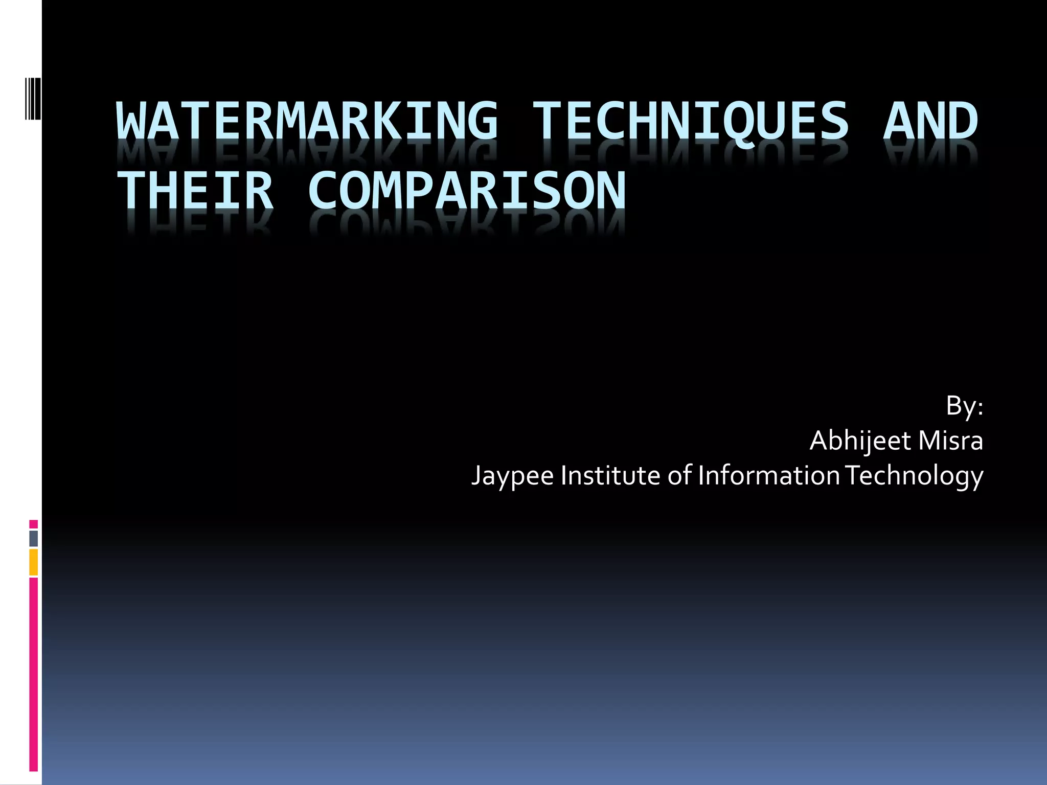 This document discusses various digital image watermarking techniques, focusing on embedding secret data into images using LSB, DWT, DCT, and FFT methods to enhance security during data transmission. It evaluates these techniques using metrics like signal-to-noise ratio and similarity ratio, concluding that while both DCT and FFT methods are robust, FFT shows superior resilience against blurring attacks. The project utilizes MATLAB for implementation and provides a comparison table of results.