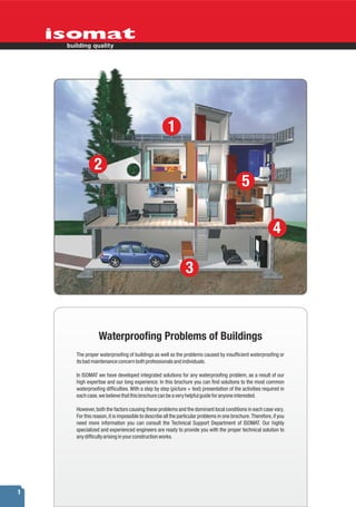 This document provides step-by-step instructions for waterproofing common building structures like terraces, balconies, basements, external walls, and humid rooms. It addresses problems caused by cracks, tiles, joints, and absorptive grouts. Solutions include local crack sealing, membrane waterproofing, and reinforcing layers with fabric. The document aims to serve as a helpful guide for waterproofing various structures and resolving moisture issues. Consultation with technical experts is recommended for unique problems.