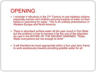 The strategic workplan aims to provide potable water throughout Oyo State within 4 years by addressing major challenges of distribution networks and power supply. Short term goals include upgrading pipes and power generators. Medium term goals involve reactivating dams by installing treatment plants, improving distribution in certain areas, and constructing mini water works and boreholes. Long term goals include utilizing the Ikere Gorge Dam for irrigation, channelizing rivers, and identifying new dam construction sites. The document outlines production capacities of existing water facilities and lists existing dams constructed in Oke-Ogun/Ibarapa areas. The overall objective is to ensure a reliable water supply for all citizens of Oyo State.