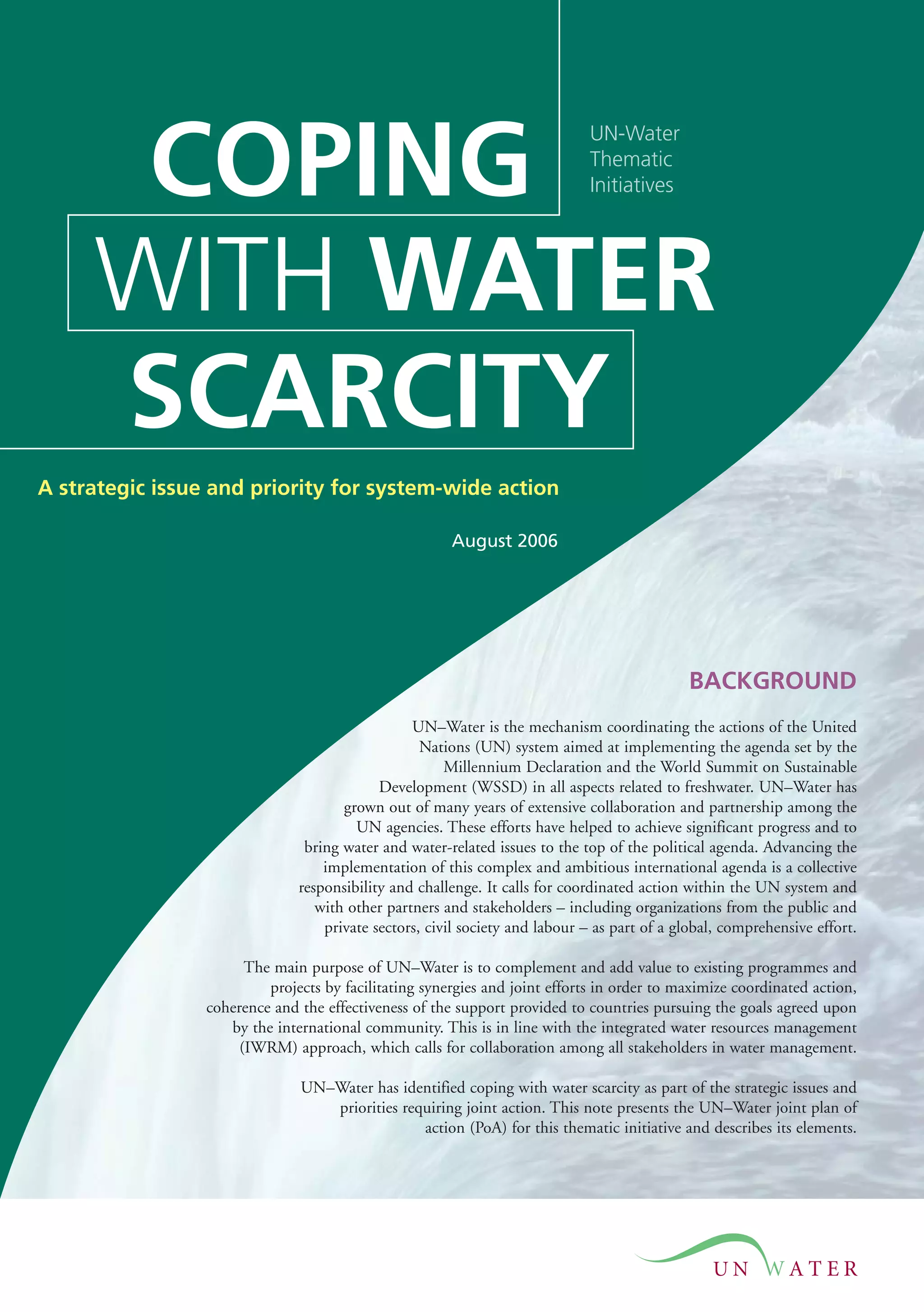 This document discusses water scarcity as a strategic issue requiring coordinated action from the UN. It provides background on UN-Water, the mechanism for coordinating UN actions on freshwater issues. The document then discusses the growing problem of water scarcity globally due to increasing demand, pollution, and climate change effects. It notes that by 2025, 1.8 billion people will live in areas of absolute water scarcity. The document emphasizes the need for integrated management of water resources and increased productivity of water use across sectors to address scarcity challenges.