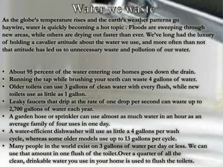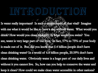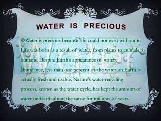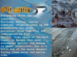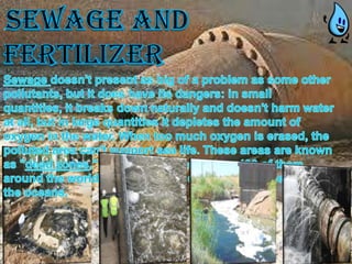 Water pollution occurs through two pathways: non-point and point source pollution. Non-point pollution has indirect sources like agricultural and road runoff that spread toxins widely, making the original polluter difficult to identify. Point source pollution originates from identifiable sources like pipes or drains. Both negatively impact water quality.