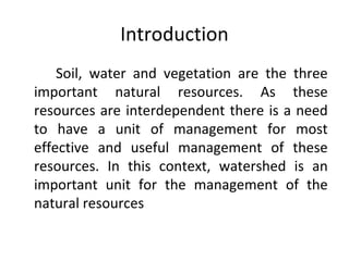 Watershed management aims to enable sustainable production and minimize hazards to natural resources like soil and water. A watershed is a geographical area that drains to a common water body. Key components of watershed management programs include soil and water conservation measures, water harvesting, and crop management and alternate land use systems suited to land capability. The overall objectives are improved livelihoods through increased incomes while protecting watershed resources.