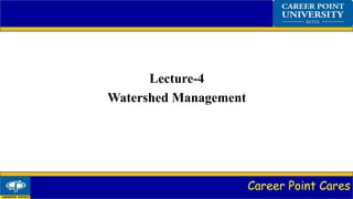 This document discusses watershed management. It defines a watershed as any surface area from which rainfall drains through a common point. Watershed management is described as implementing land and water practices to protect water quality and other natural resources within a watershed. The document outlines different types of watersheds classified by size and land use. It lists 10 objectives of watershed management programs, such as soil and water conservation and utilizing runoff water. Key concepts and principles of watershed management are also presented, including land use based on capability, rainwater conservation, and check dams to control erosion.
