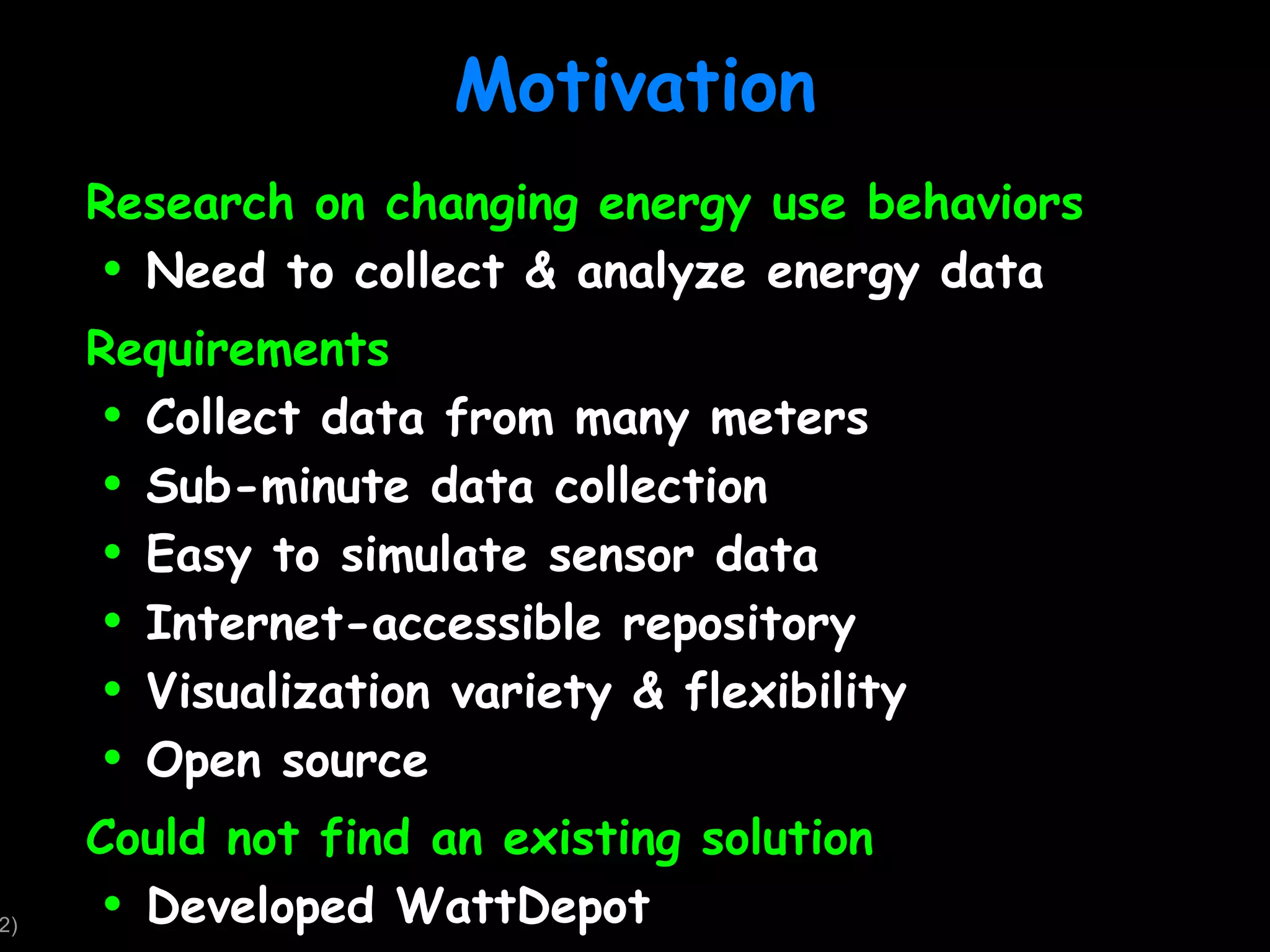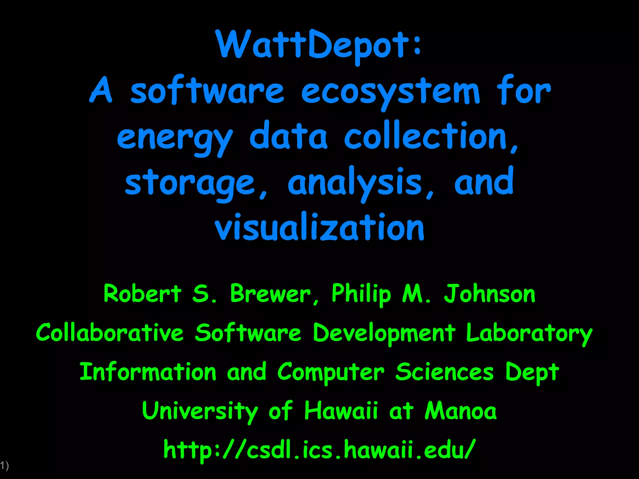 WattDepot is an open-source software ecosystem designed for the collection, storage, analysis, and visualization of energy data from various meters, enabling easy energy usage behavior research. It features flexible architecture allowing integration of diverse devices and employs RESTful APIs for data interaction, supporting real-time data visualization. Key applications include dorm energy competitions, with emphasis on privacy and data aggregation in future developments.