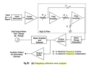 Harmonic distortion analyzers are used to measure harmonic distortion, which occurs when a nonlinear electronic component introduces harmonics into an output waveform, distorting it from the sinusoidal input waveform. There are three main types of harmonic distortion: frequency distortion due to different amplification of different frequencies, amplitude distortion from additional harmonics generated, and phase distortion from phase shifts of different frequencies caused by energy storage elements.