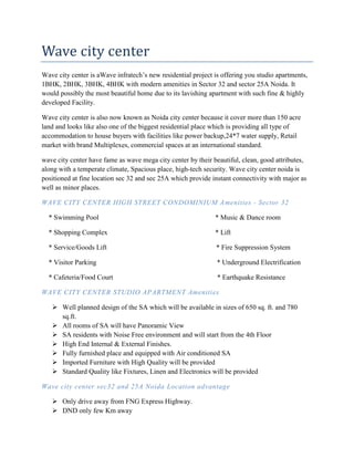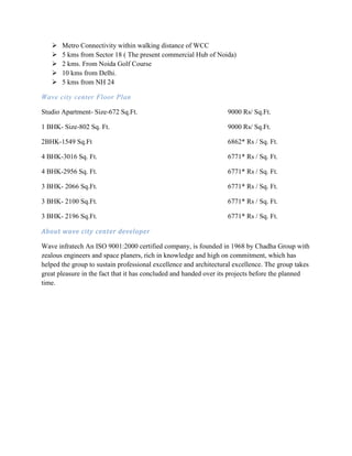 Wave City Center is a new residential project in Noida, India offering studio, 1BHK, 2BHK, 3BHK, and 4BHK apartments with modern amenities. Spread across 150 acres, it will be one of the largest residential developments in Noida with facilities like backup power, water supply, retail, and commercial spaces. Amenities will include swimming pools, shopping, lifts, and earthquake resistance. Studio apartments range from 650-780 sqft and include panoramic views, noise-free environments, and furnishings. The development is well-located near highways and metro, within 5-10kms of commercial and recreational areas. Unit prices range from Rs. 6,771-9,000