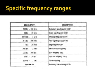 This document discusses different methods of electromagnetic wave propagation through space. There are three basic paths: ground waves which follow the Earth's curvature for lower frequencies; space waves which travel line-of-sight; and sky waves which are reflected by ionized layers in the atmosphere, allowing higher frequency signals to travel farther than line-of-sight. The ionosphere, located 30-240 miles above the Earth, plays a key role in sky wave propagation by reflecting radio signals back to Earth, enabling long-distance HF radio communications.