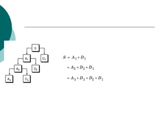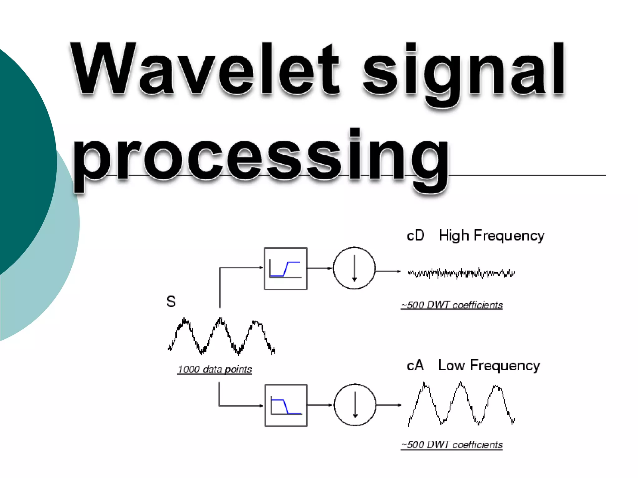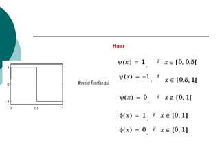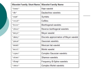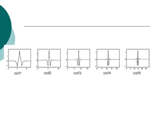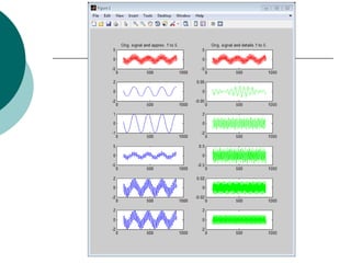 The document discusses performing a discrete wavelet transform (DWT) on a 1D signal using MATLAB. It loads a test signal, performs a 5-level DWT decomposition using the coif3 wavelet, then reconstructs the approximation and detail signals at each level. Plots of the original, approximation, and detail signals are generated.