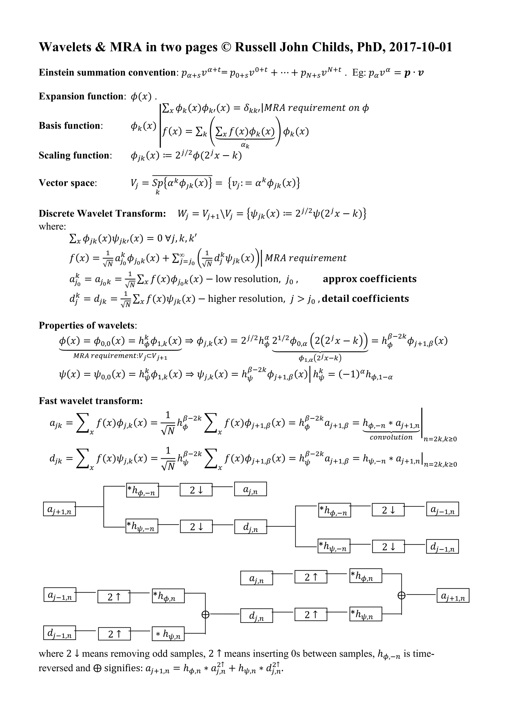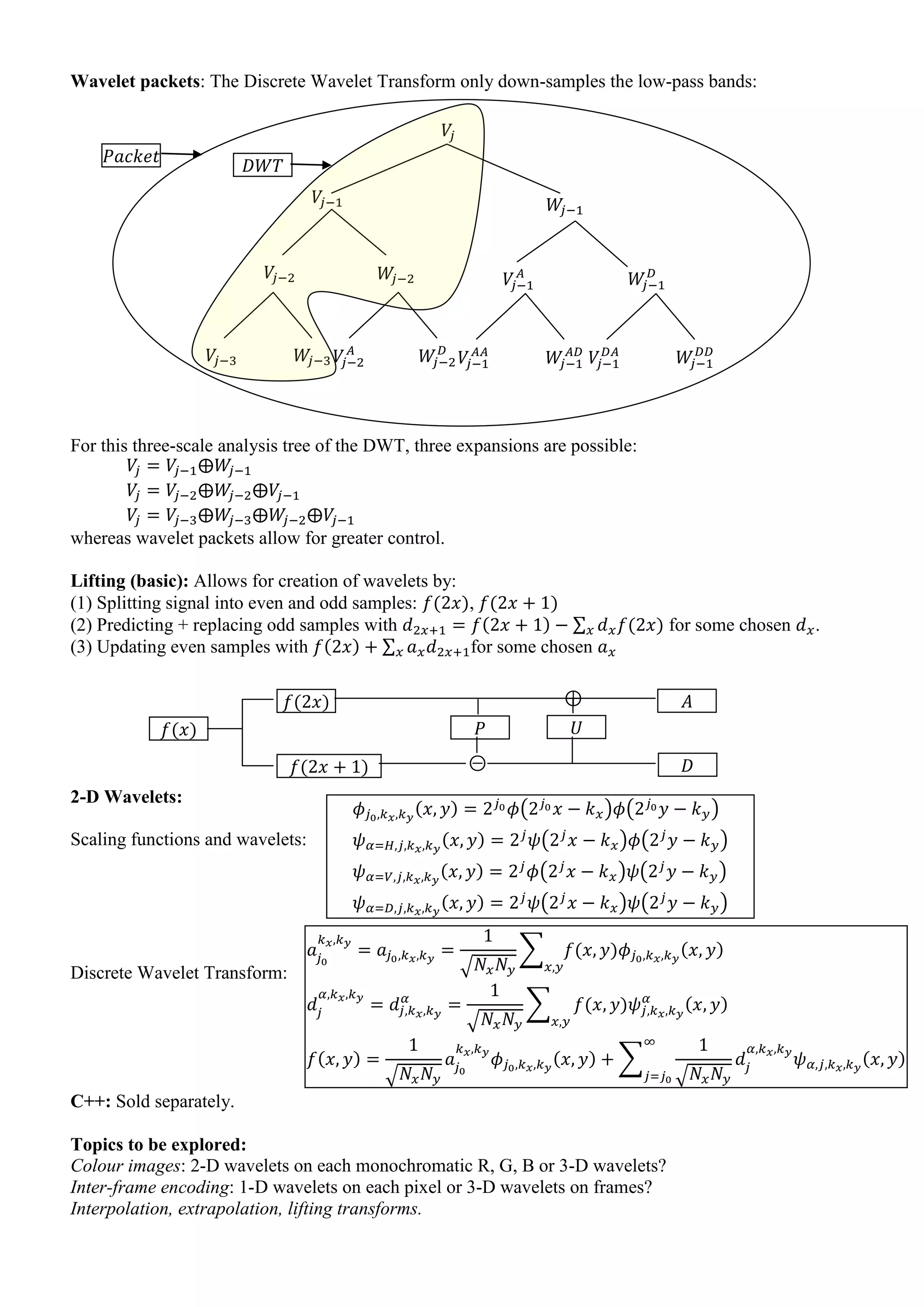 Wavelets decompose signals into different frequency bands using scaling functions and wavelet basis functions. The discrete wavelet transform (DWT) uses these functions to represent a discrete signal as a sum of wavelet coefficients at different scales. The fast wavelet transform provides an efficient algorithm to compute the DWT by successively applying filters and downsampling. Wavelet packets generalize the DWT by allowing decomposition of both low and high frequency bands at each level. Lifting transforms provide an alternative method to construct wavelets by splitting, predicting, and updating the signal. Two-dimensional wavelets extend the concepts to images by applying separable 1D wavelets along rows and columns.