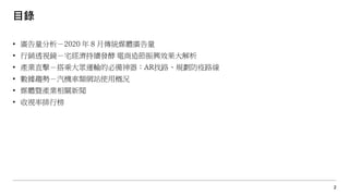 2020年1到8月,傳統媒體廣告量下降14.4%,達到十年最低,電視廣告占比回升至69%。有線電視、報紙和戶外廣告最為下滑,而醫藥美容及清潔品類廣告呈現增長。整體廣告量趨勢持平,部分媒體類別如健康食品和信息類網站廣告投資增加。