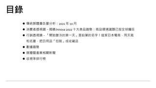 本报告分析了2021年10月份台湾传统媒体的广告量,比较了2021年与2020年同期的数据。整体广告量在2021年略有增长,以户外广告和有线电视广告为主要推动因素,而报纸和广播广告量则显著下降。不同产业的广告投资趋势显示出医疗美容类和电器类别广告增加,而建筑类和媒体公司的广告支出明显减少。