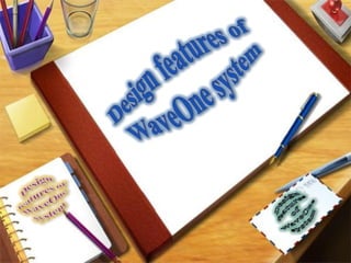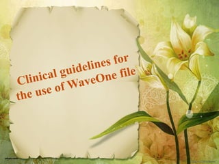 This document discusses the WaveOne single-file reciprocating system for shaping root canals. It describes how WaveOne files utilize unequal clockwise and counterclockwise angles of rotation to optimize cutting efficiency while reducing risks. A single WaveOne file is generally sufficient to fully shape any canal. The document outlines guidelines for proper use of the WaveOne system, including creating a glide path, selecting the correct file size, irrigating after each cutting cycle, and using the file in a slow reciprocating motion until the working length is reached.
