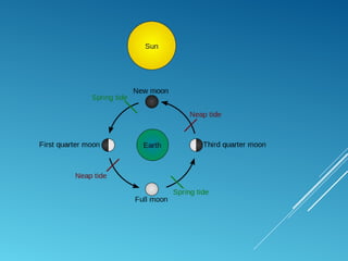 Waves and tides are caused by the gravitational pull of the moon and sun. There are different types of waves including wind waves and tsunamis. Tides are the regular rising and falling of ocean water levels caused by lunar and solar gravitational forces. High tides occur when the gravitational pulls act in alignment and low tides occur when they are perpendicular. Tides are important because they allow for shipping in harbors and prevent freezing in cold weather ports.