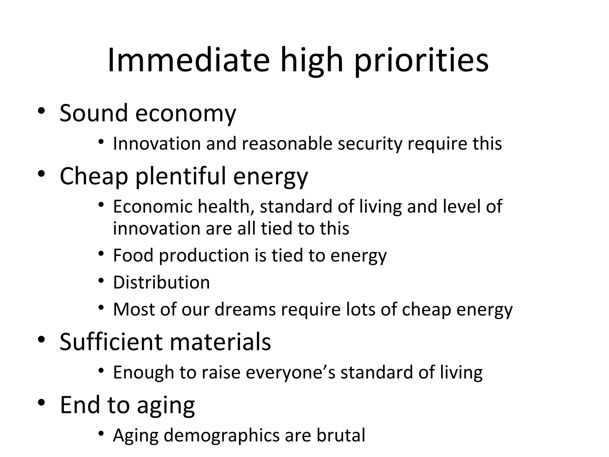 The document discusses several high priorities needed to move forward, including a sound economy, cheap and plentiful energy, sufficient materials, and an end to aging. It notes the economic realities of high debt levels, lower tax revenues, aging demographics, and governments overpromising on entitlement programs. Thorium reactors, anti-aging research, asteroid mining, and continued technological progress are proposed as ways to address energy, materials, and aging issues. Economic changes like balanced budgets, entitlement reforms, and incentives for business are also suggested.