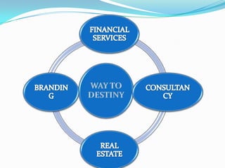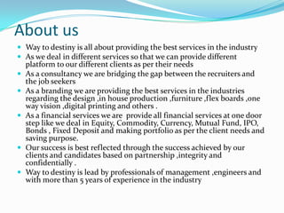 Way to Destiny is a consultancy that provides various services including recruitment, financial services, branding, and real estate, aimed at bridging gaps between job seekers and recruiters. They offer financial investment options such as equity, commodities, mutual funds, and bonds, and emphasize responsible investment practices. The company prides itself on a client-centric approach that reflects their success through the achievements of their clients based on professionalism and integrity.