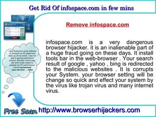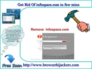 Infospace.com is identified as a dangerous browser hijacker that negatively impacts PC performance by redirecting search results and corrupting browser settings. Users can choose between manual and automatic methods for removal, with the latter being quicker and simpler. The document recommends utilizing specific removal tools and strategies to enhance PC performance and eliminate the hijacker.