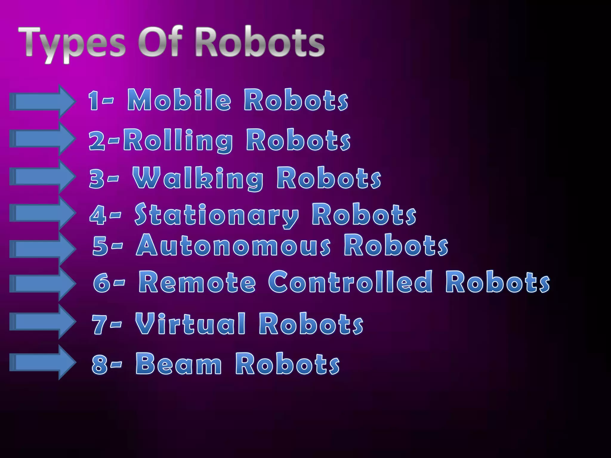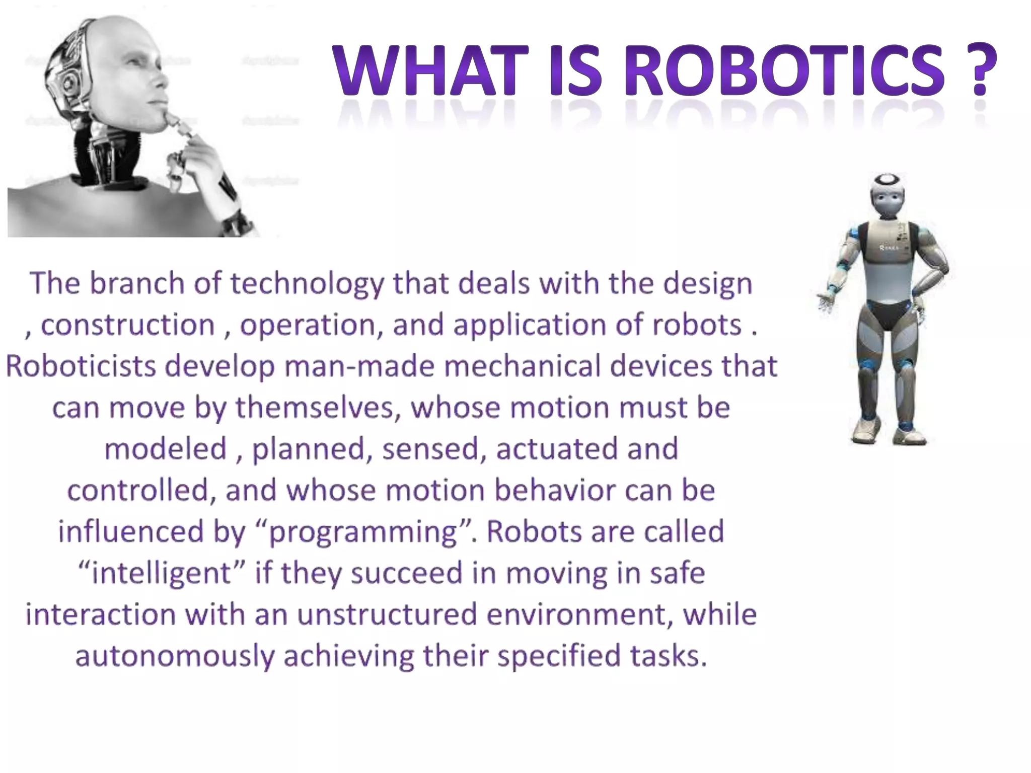 This document discusses the history and types of robots. It notes that the term "robotics" was first used by Karel Capek in the 1920s to describe artificial workers. Isaac Asimov later proposed three laws of robotics to ensure robots do not harm humans. The first industrial robot was Unimate, which was installed in a GM plant in the 1960s to perform dangerous jobs. The document then describes the main components of industrial robots like sensors, effectors, actuators, controllers, and arms. It also discusses different types of robots including mobile, stationary, autonomous, and virtual robots.