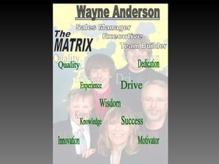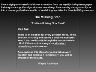 The document is a resume for Wayne Anderson, who is seeking an executive team building position. It summarizes his qualifications and extensive experience in sales, management, and business development for companies that produce machinery for the newspaper and printing industries. The resume also includes a sample recipe as a bonus for reviewing his qualifications.