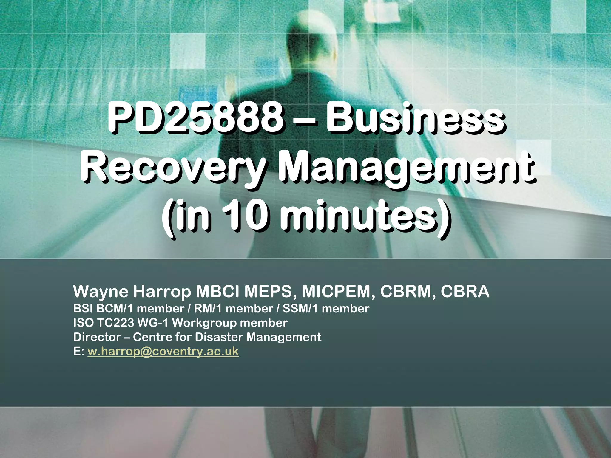 PD25888 provides guidance on business recovery management (BRM) which aims to help organizations recover from damaging incidents through rebuilding and restoration. It is meant to complement existing standards on business continuity management. BRM involves establishing a business recovery management team (RMT) that serves as the strategic decision-making authority during recovery. The RMT structure may include internal and external representatives from key areas. The standard provides examples of issues the RMT may consider like products/services, infrastructure, staffing, and finances. It also stresses the importance of ongoing situation assessments to inform the RMT's strategic decisions around resource redirection, priorities, policies and communications during recovery.