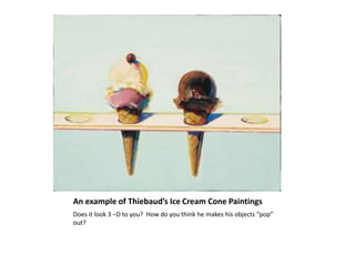 Wayne Thiebaud is an American painter known for his paintings of everyday objects like cakes, pastries, and cosmetics. He uses thick paint and exaggerated colors to depict his subjects, making them appear 3D and realistic. Though associated with Pop art for his focus on mass culture items, Thiebaud began creating these works in the 1950s, just before the Pop art movement. He includes heavy shadows in the style of advertisements, informed by his early career in advertising design.