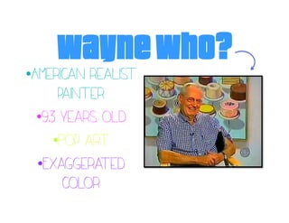 The document discusses American realist painter Wayne Thiebaud, known for his pop art style paintings exaggerating color. At 93 years old, examples of his work featuring sweets and treats can be seen at the Kemper Art Museum and the Nelson-Atkins Art Museum, including his 1964 painting "Bikini". The document notes Thiebaud loved using repetition and thick paint to depict his exaggeratedly colored subjects.