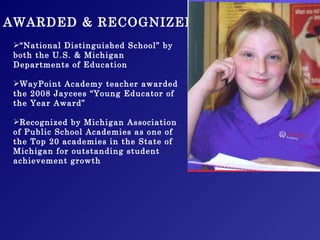 WayPoint Academy is a charter school in West Michigan that has received several awards and recognition for its success in student achievement growth and preparing students for careers. It offers a unique program where students can earn both a high school diploma and career readiness certificate. Students learn in a small, supportive environment and have opportunities for internships, apprenticeships, and taking college classes. The school aims to develop skilled graduates who are ready to enter the workforce or post-secondary education with strong academic and career skills.
