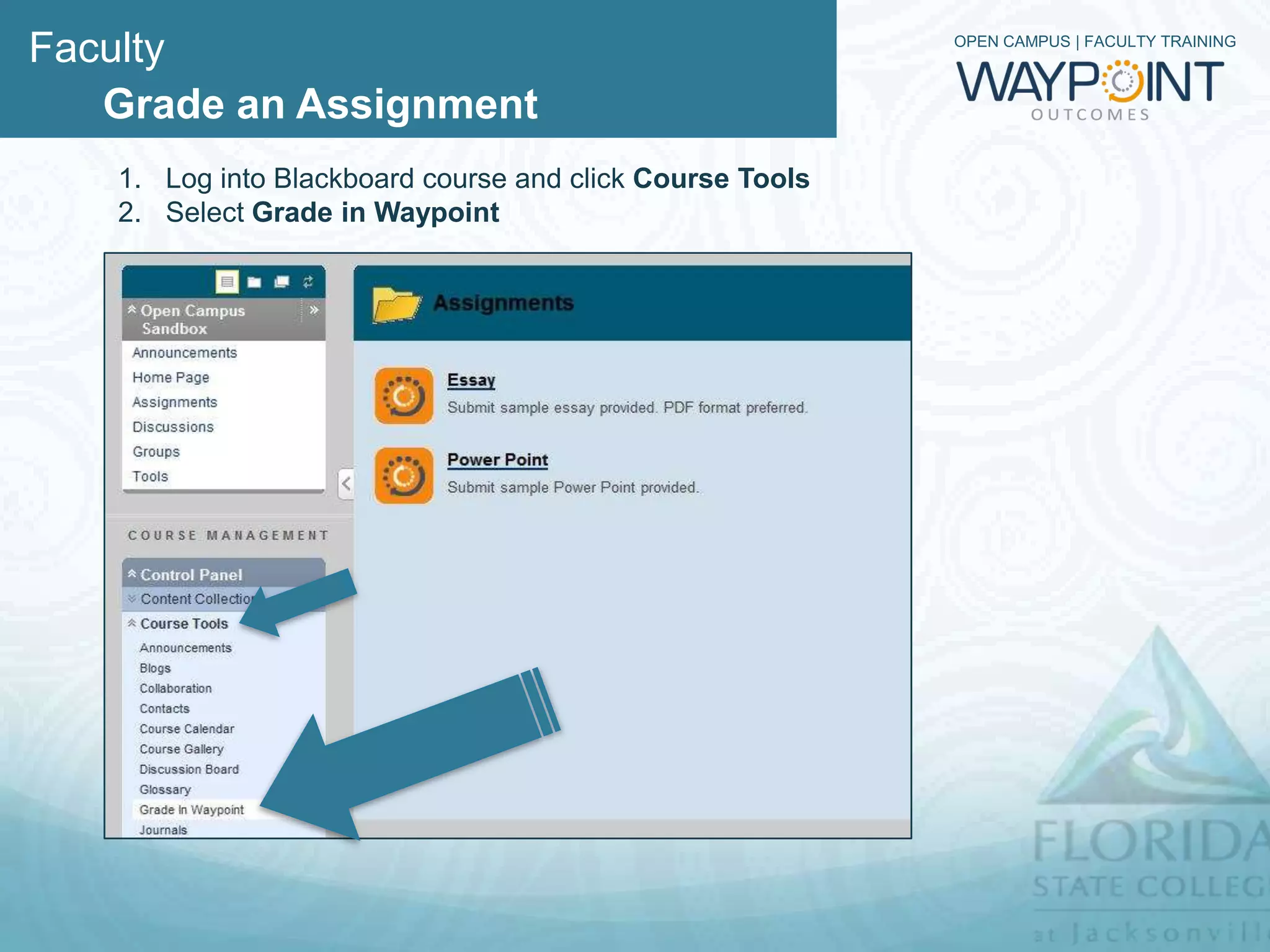 The document provides instructions for faculty to grade assignments within the Blackboard learning management system. It outlines 12 steps to complete the grading process, including logging into Blackboard, selecting an assignment to grade, using markup tools to provide comments and feedback, assessing assignments against a rubric, navigating between student submissions, and ending the grading session.