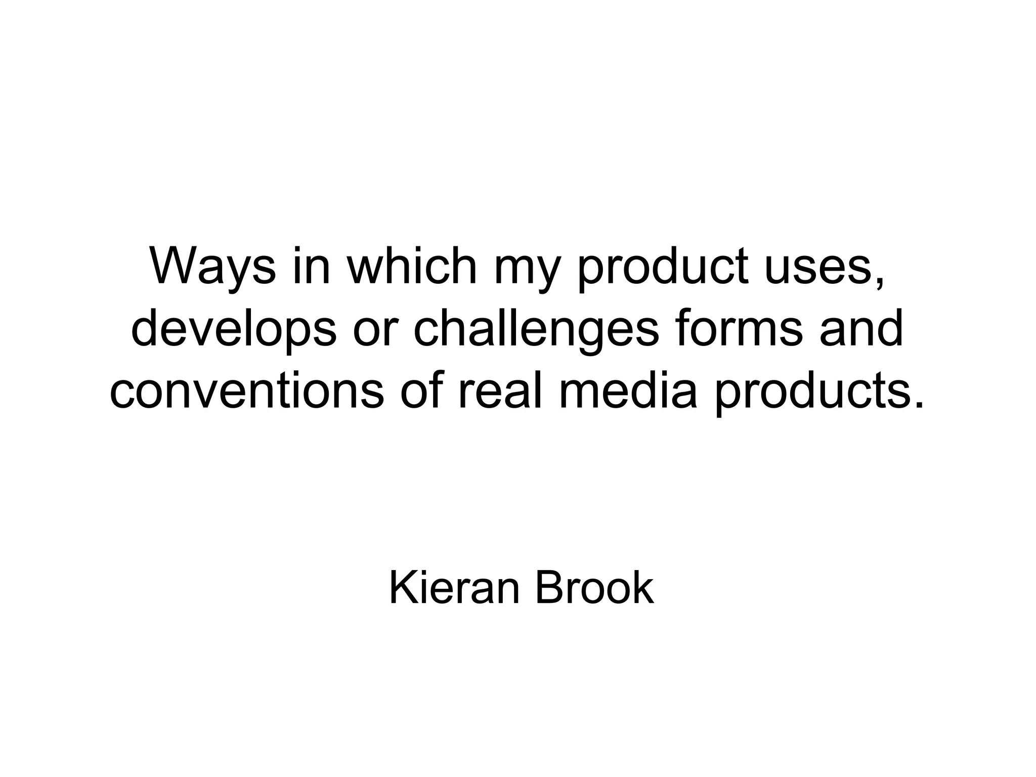 This document discusses how a music video for an R&B song develops conventions of the genre. It uses conventions like featuring a love interest, using colors to reflect the mood, and showing flashbacks differently. However, it also challenges some conventions, like using a black background for the chorus instead of a set location. The document also discusses how the digipak and magazine ad conform to R&B conventions by selling the artist but the ad breaks convention with its text layout.