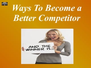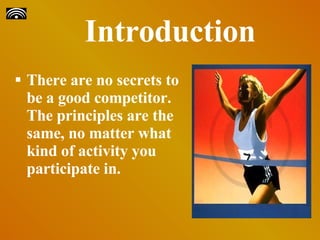 There are no secrets to becoming a good competitor. The document provides strategies for competitors such as focusing on the competition rather than the outcome, coming prepared by knowing about opponents, and using nutrition to your advantage by improving diet and hydration. Competitors should also identify their strengths and make them central to their performance.