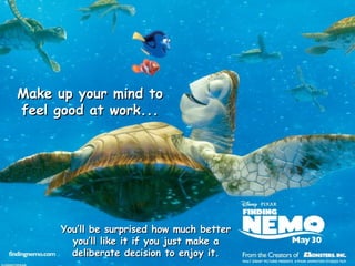 The document provides tips for enjoying work, such as maintaining good relationships with colleagues, challenging yourself by setting goals, focusing on the positives of your job like the services you provide, and adopting an attitude of ownership over your company. Changing your mindset to find fulfillment in your work, rather than focusing on negatives, can help you enjoy your job more.