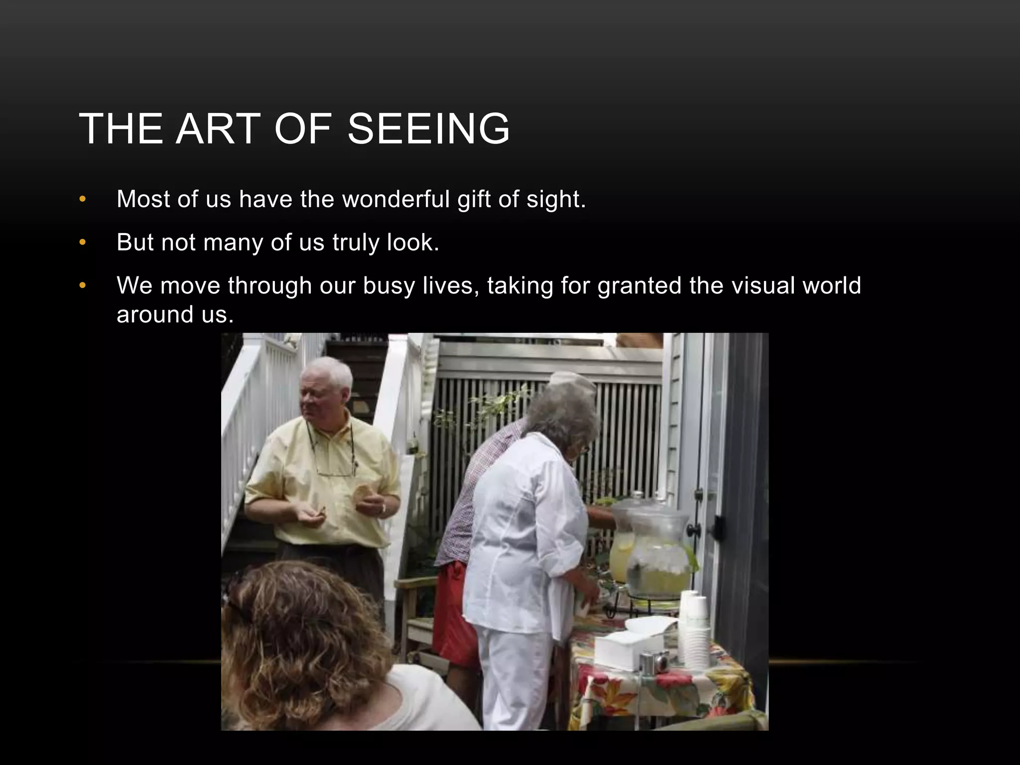 This document discusses ways of seeing and how to train oneself to truly observe the visual world. It explains that most people do not actively notice the shapes, patterns, colors and textures around them. Learning to draw or take photos requires analyzing scenes in new ways, as these mediums create abstracted representations rather than capturing objective reality. The document provides tips for photographers to learn how to see, such as paying attention to light, isolating subjects of emphasis, considering backgrounds, and using techniques like selective focus and rim lighting to create visual interest and depth.